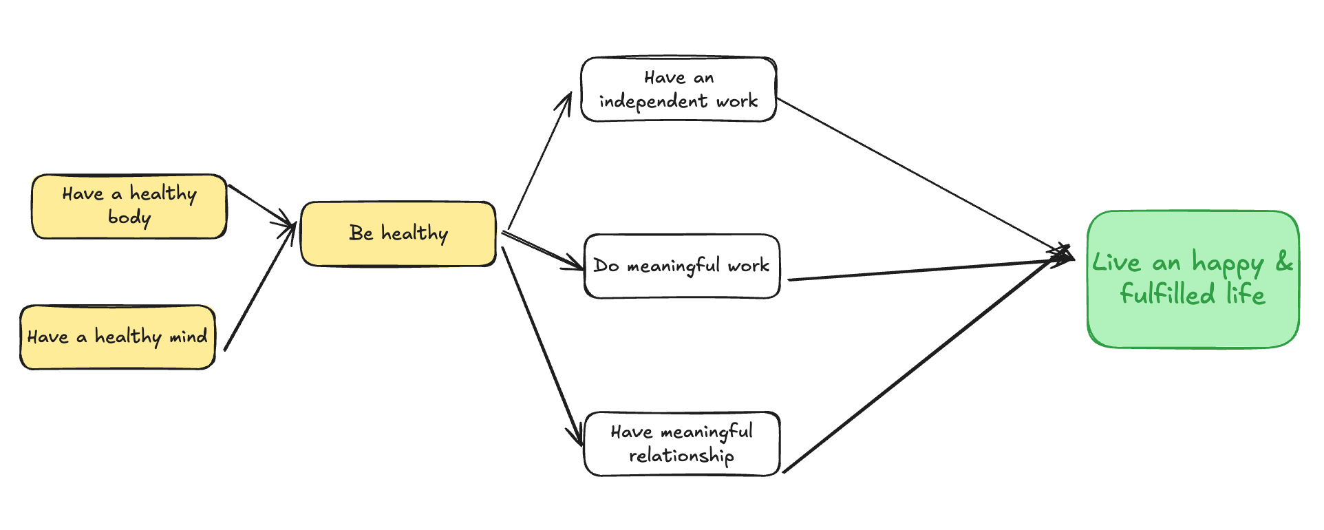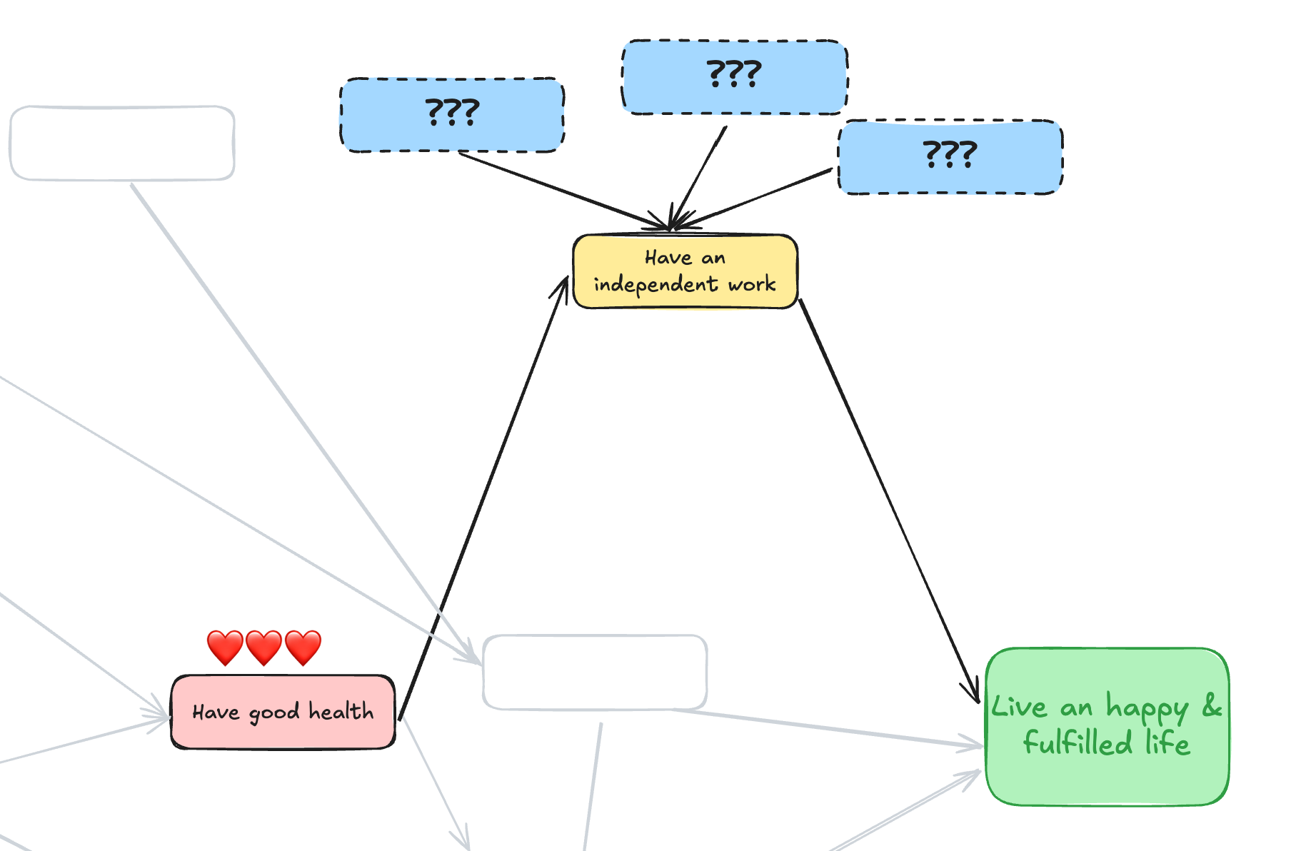 Và cứ đi ngược lại như vậy, mình đã vẽ được một bản đồ hệ thống full của mình, một "causal model" của bản thân. Nó trông như thế này: