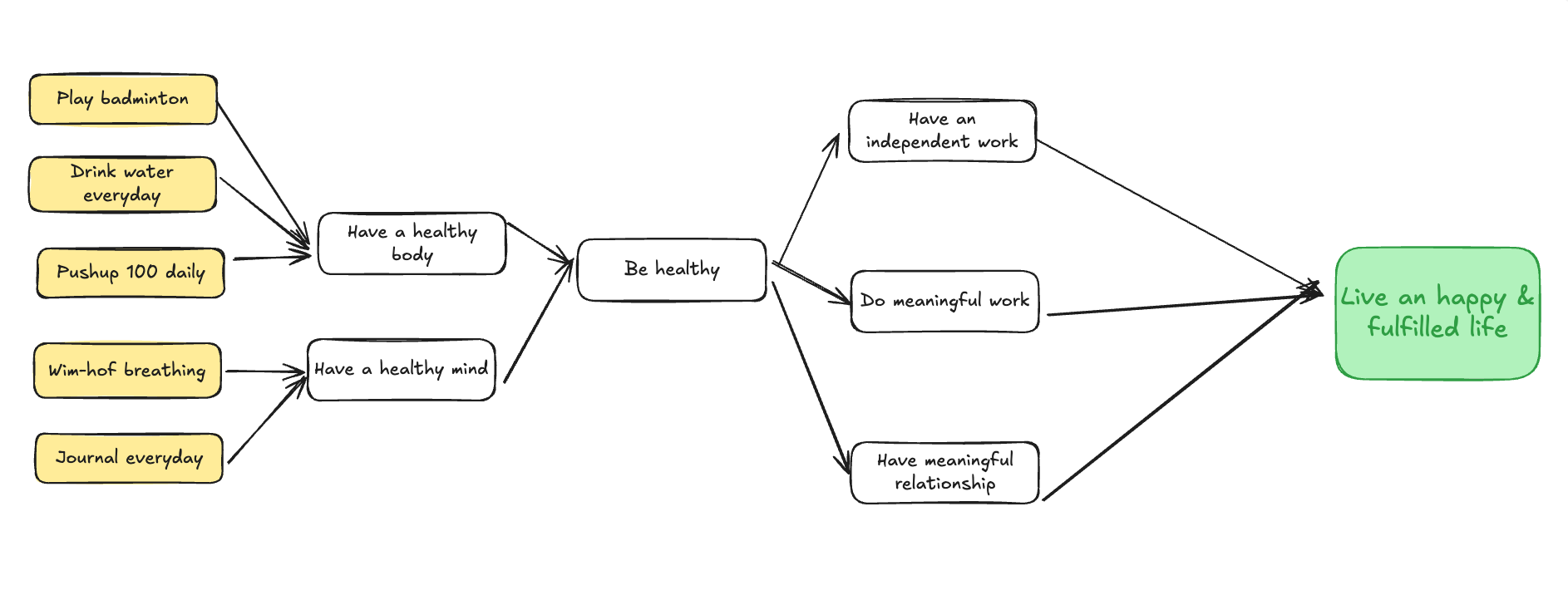 Và khi work sâu hơn nữa, mình nghĩ mình đã đến được những thứ cơ bản và actionable nhất. Để có sức khoẻ mạnh, mình cần tập thể thao như đánh cầu lông, hay hít đất và uống đủ nước. Để có đầu óc minh mẫn, mình cần tập thiền, tập thở wim-hof, và viết nhật kí mỗi ngày.