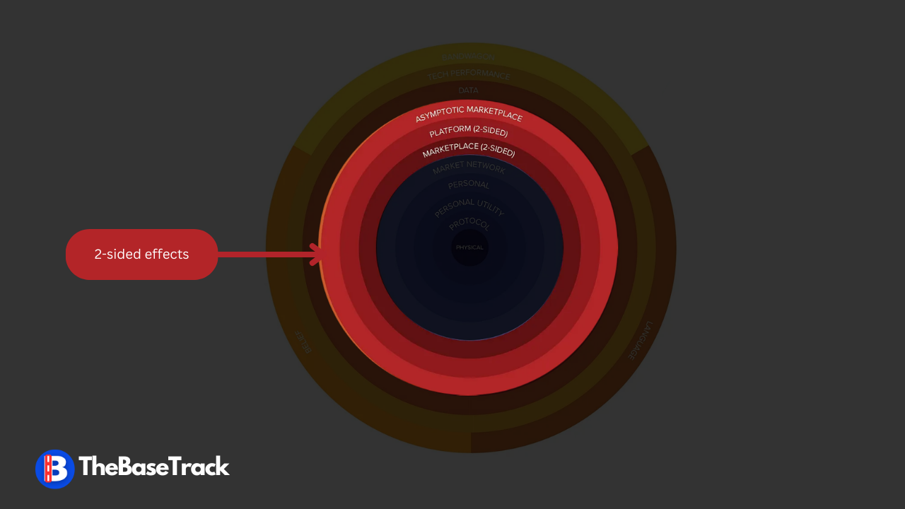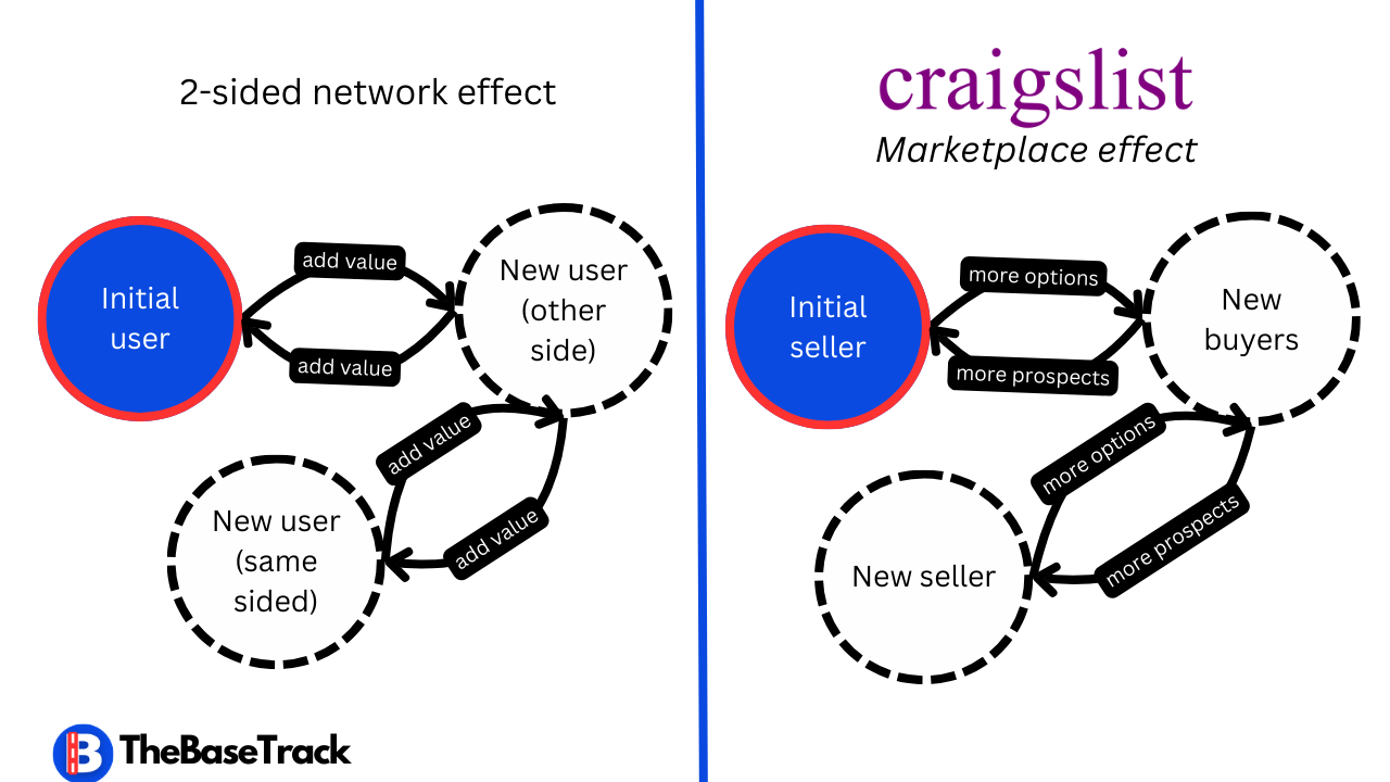 The second type of network effects is 2-sided network effects. It conveys how new users on one side increase value for the other side of the product.