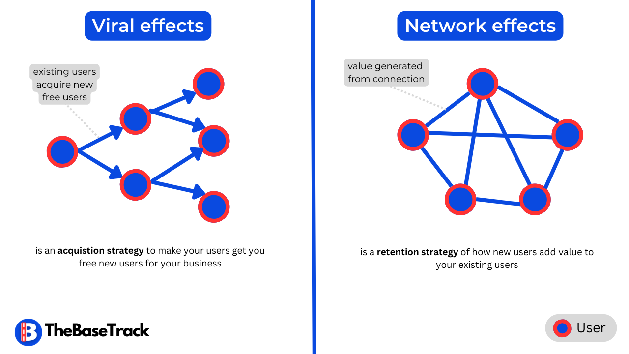 While viral effects concern more about how your existing users get you free new users, network effects concern how new users add value to existing users - and eventually as the networks grows, the more value it is for everyone else.